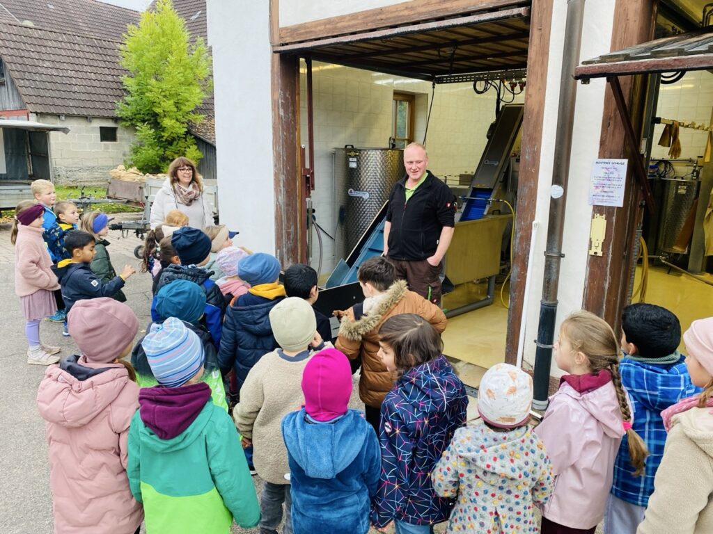 Im Rahmen des Sachunterrichts der Klasse 1 stand das Thema Apfel im Mittelpunkt. Als ergänzender Lernbaustein unternahm die Klasse einen Lerngang zur Mosterei Schrade in Egenhausen. Ziel des Ausflugs war es, den Kindern den Weg vom Apfelsaft zu zeigen – vom Apfel bis zum frisch gepressten Saft – und wichtige Inhalte rund um Äpfel praktisch zu erleben.