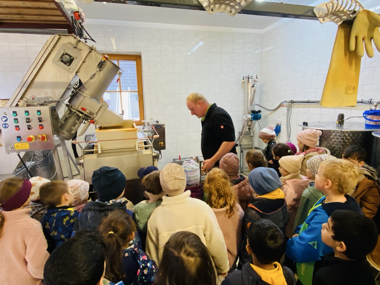 Zu Beginn der Exkursion begrüßte Herr Enrico Schrade die Kinder herzlich. In der Führung erläuterte er anschaulich, wie aus einem Sack Äpfeln Saft entsteht und wie dieser anschließend haltbar gemacht wird. Die Schülerinnen und Schüler erhielten zahlreiche Informationen zu den Inhaltsstoffen von Äpfeln, zum Ablauf des Pressvorgangs sowie zu den Maschinen in der Mosterei. Besonders spannend war die Praxisnähe: Die Kinder konnten beobachten, wie der Saft durch Presse und Verarbeitungsschritte läuft und schließlich frisch gewonnen wird.